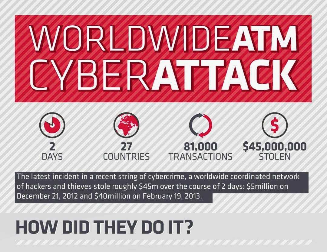 這裡詳述了半年多前,一起全球性的網路銀行搶案,電腦駭客在兩天內偷走四千五百萬美金的過程。 大約半年多前,有一個由小偷與駭客組成的國際性犯罪組織,從全球的自動提款機(ATM)偷走了大約四千五百萬美金(2012 年 12 月 12 日偷了五百萬,2013 年 2 月 19 日偷了四千萬),整起犯罪只花了兩個工作天,橫跨 27 個國家,進行了 8100 筆交易。 ...
