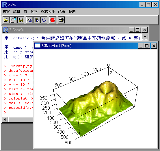 RGL 是一套 R 的套件,它可以讓使用者在 R 的環境下畫出高品質的 OpenGL 3D 圖形,更可以讓使用者透過滑鼠旋轉或放大圖形,即時的看到圖形的每個角度,用起來不輸 Matlab,對於有 3D 資料分析需求的使用者來說,相當方便!只是對一般使用者而言,想要使用他必須先熟悉 R 的語法,R 是一個開放原始碼的統計軟體,跟 S-plus 非常相似,但沒學過的人恐怕還是要花上一小段時間。 ...