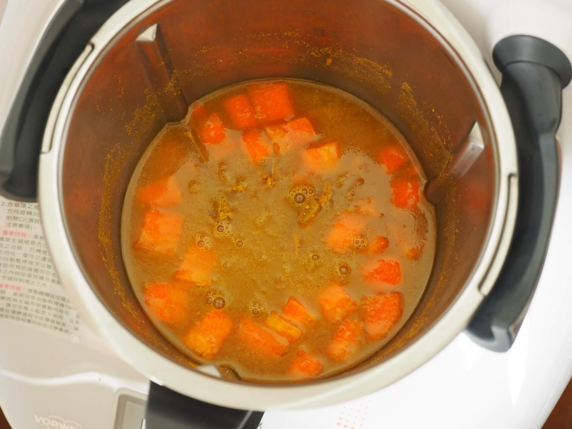 這裡的咖哩飯是參考美善品官方食譜的蔬菜咖哩,不過官方的版本是葷的(有加洋蔥),這裡我把洋蔥拿掉,做成素食的咖哩飯。