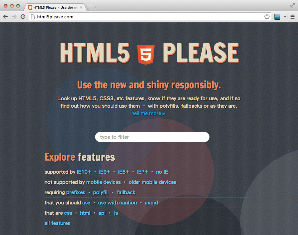 HTML5 Please 整理了各種新的 HTML5 與 CSS 語法在各種瀏覽器上的相容性狀況,並提供使用上的建議。 在開發網頁的應用程式時,開發者所撰寫的 HTML5 或 CSS 程式碼通常都要面對許多不同瀏覽器的相容性問題,而 HTML5 Please 是一個可以查詢各種 HTML5 與 CSS 的語法在各種瀏覽器中被支援的狀況,並且建議你是否應該使用,你可以依據哪一些瀏覽器支援哪一些語法來選擇要使用的語法。 ...