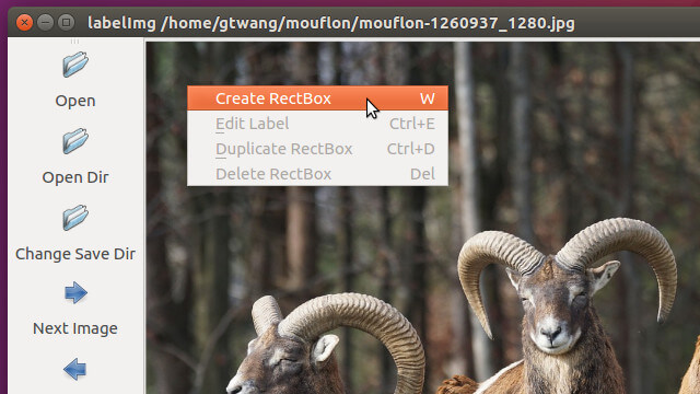 開啟 LabelImg 之後,首先開啟想要進行標註的圖片檔,開啟時可以選擇「Open」開啟單張圖檔,或是以「Open Dir」開啟整個目錄中所有的圖檔。